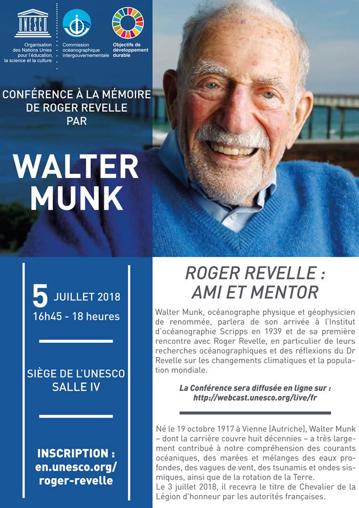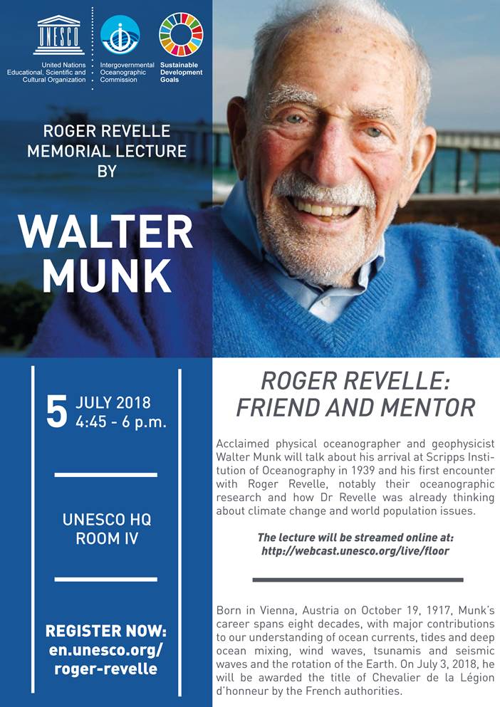 “It is an honour for UNESCO to receive Professor Munk and benefit from his insights into the great progress of oceanography and how much further it can go in contributing to the safeguarding of our shared ocean and the construction of a more sustainable world,” said Audrey Azoulay, the Director-General of UNESCO. The IOC Executive Council will present Walter Munk with the UNESCO Roger Revelle Medal, which, like the memorial lecture itself, is named after Roger Revelle (USA, 1909—1991), a pioneering researcher into, among other subjects, anthropogenic global warming.